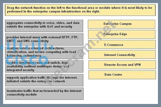 Drag the network function on the left to the functional area or module where it is most likely to be performed in the enterprise campus infrastructure on the right.