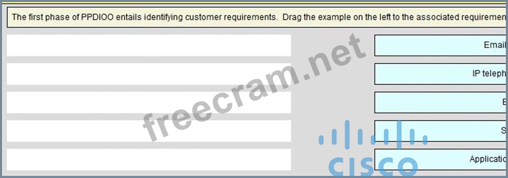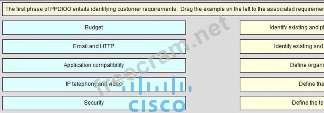The first phase of PPDIOO entails identifying customer requirements. Drag the example on the left to the associated requirement on the right.