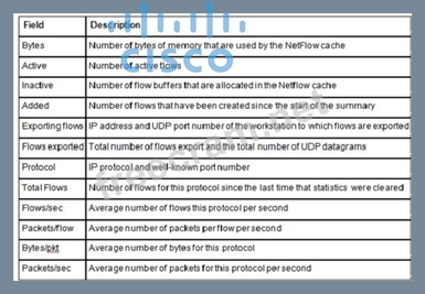 Explanation/Reference: Explanation: NetFlow provides extremely granular and accurate traffic measurements and a high-level collection of aggregated traffic. The output of netflow information is displayed via the show ip cache flow command on routers. The Table shows a description of the fields for NetFlow output. Table. Netflow Output escription