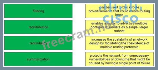 CCDA 200-310 Official Cert Guide, Chapter 2, Route Redundancy, pp. 63-64 CCDA 200-310 Official Cert Guide, Chapter 11, Route Summarization, pp. 455-458 CCDA 200-310 Official Cert Guide, Chapter 11, Route Redistribution, pp. 458-461 CCDA 200-310 Official Cert Guide, Chapter 11, Route Filtering, pp. 461-462 Cisco: Redistributing Routing Protocols: Introduction