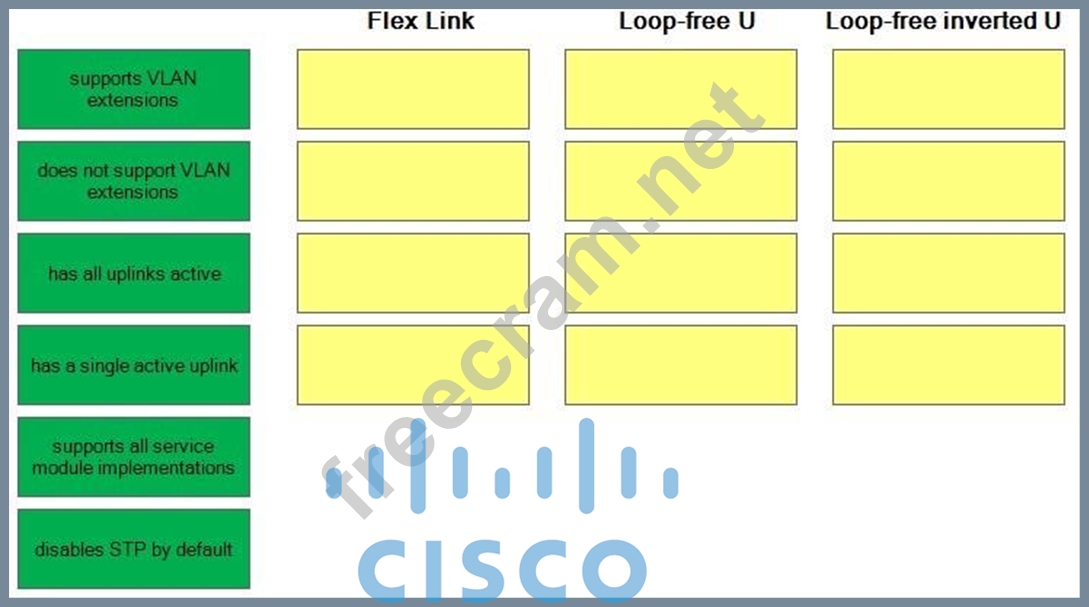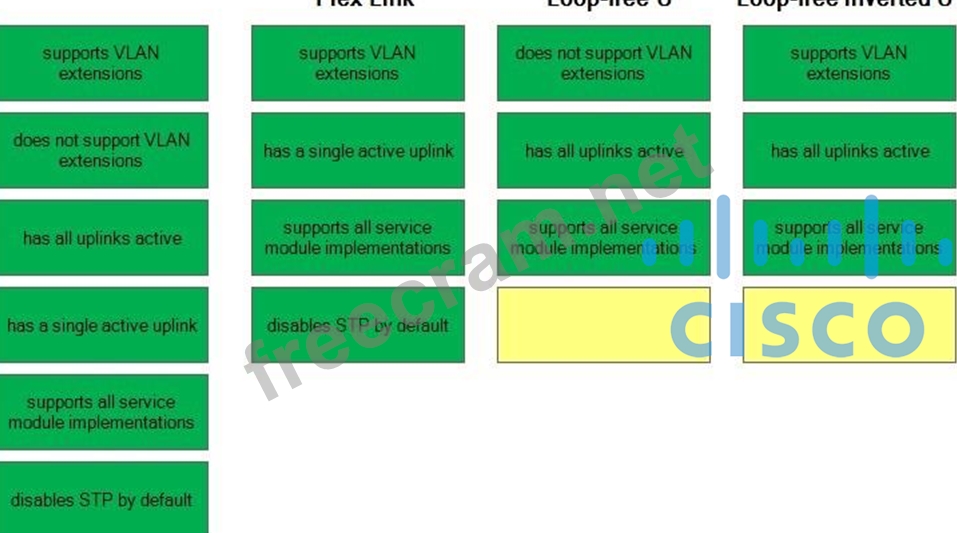 Loop-free inverted U designs support all service module installations, have all uplinks active, and support virtual LAN (VLAN) extensions. A service module is a piece of hardware that extends the functionality of a Cisco device, for example, the Secure Sockets Layer (SSL) Service Module for Catalyst 6500 series switches and Cisco 7600 series routers performs the majority of the CPU-intensive SSL processing so that the switch's processor or router's processor is not burdened by large numbers of SSL connections. Loop- free inverted U designs offer redundancy at the aggregation layer, not the access layer; therefore, traffic will black-hole upon failure of an access switch uplink. All uplinks are active with no looping, thus there is no Spanning Tree Protocol (STP) blocking by default. However, STP is still essential so that redundant paths that might be created by any inadvertent errors in cabling or configuration are blocked.