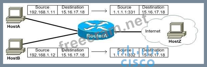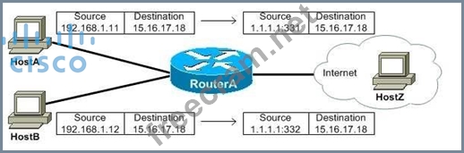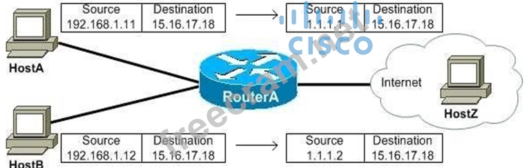 The network in this scenario uses Network Address Translation (NAT) overloading. NAT overloading uses ports to translate inside local addresses to one or more inside global addresses. The NAT router uses port numbers to keep track of which packets belong to each host. NAT overloading is also called Port Address Translation (PAT).