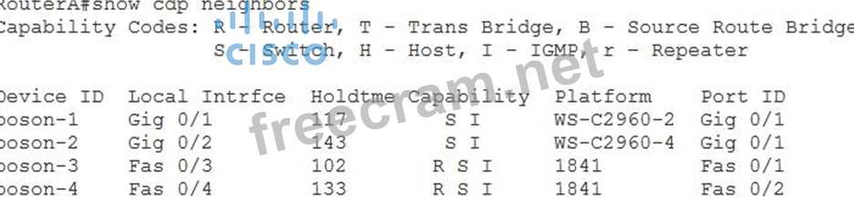 The Device ID field indicates the host name, Media Access Control (MAC) address, or serial number of the neighboring device. The Local Intrfce field indicates the interface on the local device. The Holdtme field indicates the amount of time remaining before the CDP advertisement is discarded. The Capability field indicates the type of device: