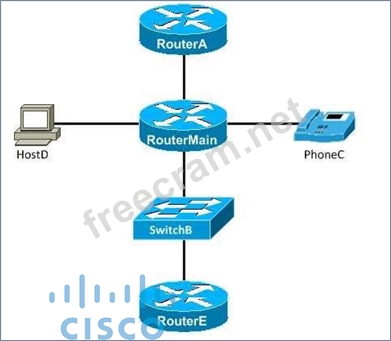 Information about SwitchB and PhoneC will be displayed in the output of the show cdp neighbors command on RouterMain. Cisco Discovery Protocol (CDP) is used to advertise and discover Cisco devices on a local network. CDP is enabled by default on many Cisco devices, but it can be disabled for security purposes. When CDP is enabled, devices periodically send advertisements out each CDP-enabled interface. These advertisements contain information about the capabilities of the device and are sent to a hardware multicast address. Each directly connected CDP-enabled device receives the broadcast and uses that information to build a CDP table. The CDP table information can be used in conjunction with data gleaned from commandline interface (CLI) output, such as that from the traceroute command, to build a topology map of an existing network.