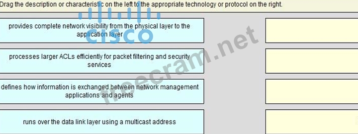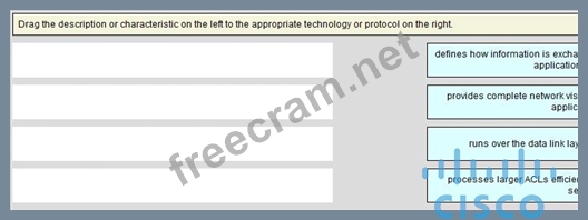 Drag the description or characteristic on the left to the appropriate technology or protocol on the right.