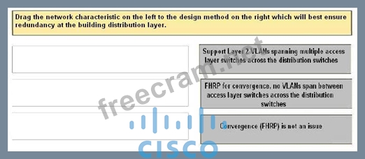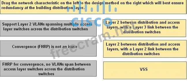 Drag the network characteristic on the left to the design method on the right which will best ensure redundancy at the building distribution layer.