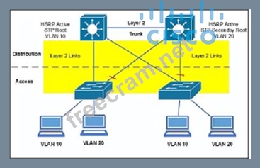 The red lines refer to STP blocked ports. What happens if the HSRP active moves to the right distribution, and the STP root remains on the left distribution?