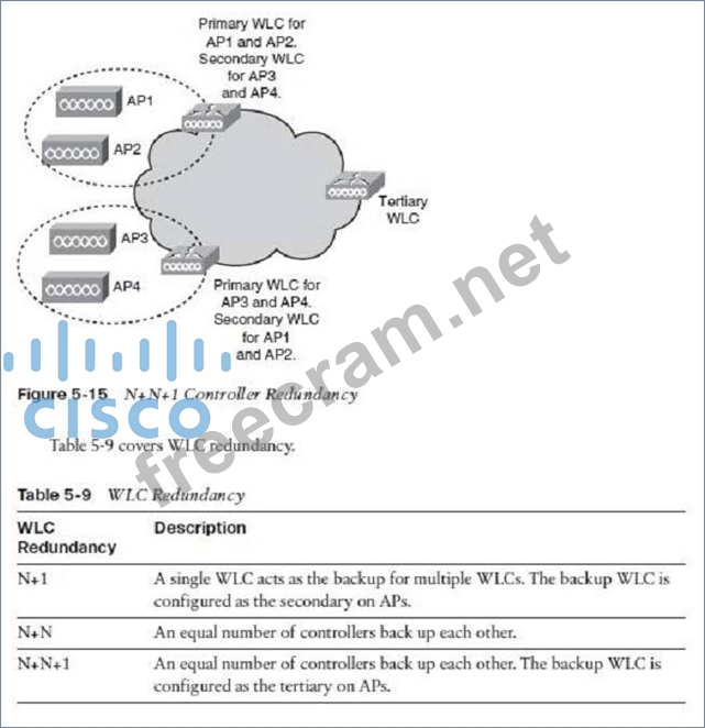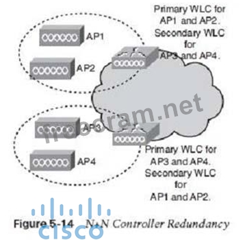 Reference: http://www.cisco.com/web/learning/le31/le46/cln/qlm/CCDA/design/understanding-wireless- network-controller-technology-3/player.html N+N WLC Redundancy With N+N redundancy, shown in Figure 5-14, an equal number of controllers hack up each other. For example, a pair of WLCs on one floor serves as a backup to a second pair on another floor. The top WLC is primary for API and AP2 and secondary for AP3 and AP4. The bottom WLC is primary for AP3 and AP4 and secondary for API and AP2. There should be enough capacity on each controller to manage a failover situation.