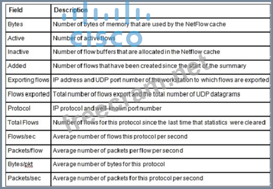 Explanation/Reference: Explanation: NetFlow provides extremely granular and accurate traffic measurements and a high-level collection of aggregated traffic. The output of netflow information is displayed via the show ip cache flow command on routers. The Table shows a description of the fields for NetFlow output. Table. Netflow Output escription