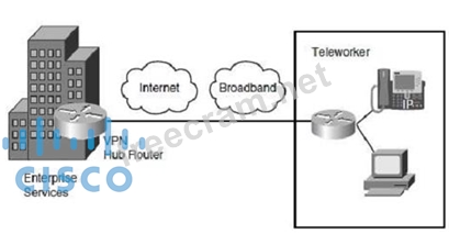 The Cisco Virtual Office Solution for the Enterprise Teleworker is implemented using the Cisco 800 series ISRs. Each ISR has integrated switch ports that then connect to the user's broadband connection. The solution uses a permanent always-on IPsec VPN tunnel back to the corporate network. This architecture provides for centralized IT security management, corporate-pushed security policies, and integrated identity services. In addition, this solution supports the enterprise teleworker needs through advanced applications such as voice and video. For example, the enterprise teleworker can take advantage of toll bypass, voicemail, and advanced IP phone features not available in the PSTN.