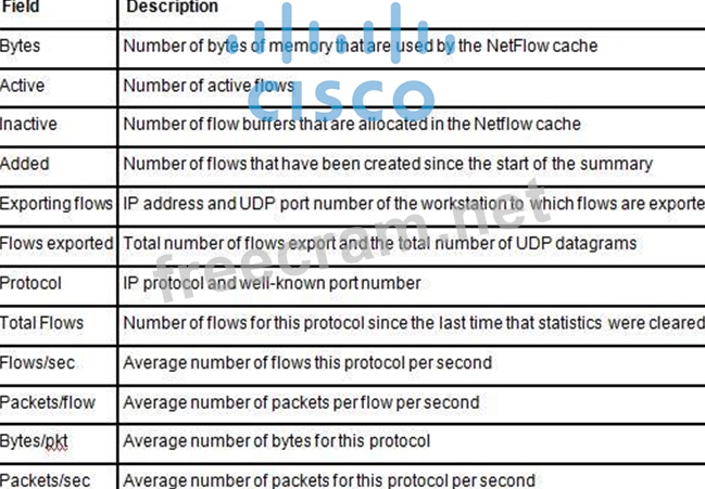 Explanation NetFlow provides extremely granular and accurate traffic measurements and a high-level collection of aggregated traffic. The output of netflow information is displayed via the show ip cache flow command on routers. The Table shows a description of the fields for NetFlow output. Table. Netflow Output escription