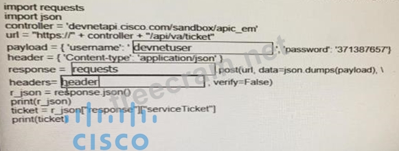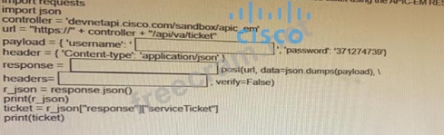 Fill in the blanks to complete the python script to request a service ticket using the APIC-EM rest API for the user "devnetuser".