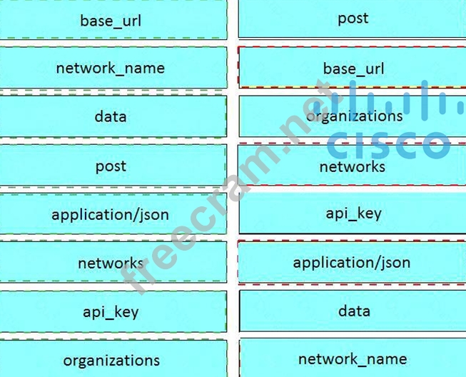 Drag and drop the code from the left onto the item numbers on the right to complete to Meraki python script shown in the exhibit.