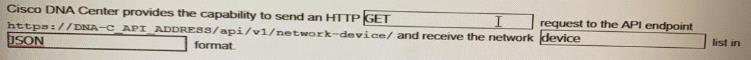 Cisco DNA provide the capability to send an HTTP _______________ request to the API endpoint https://DNA-c_API_ADDRESS/api/vi/network-device/ and receive the network __________ list in __________ format.