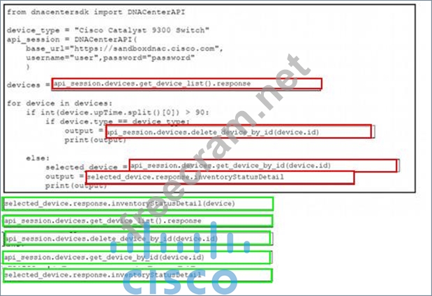 A Python script must delete all Cisco Catayst 9300 Series switches that have an uptime that is greater than 90 days The script must also query for the status of all the other devices Drag and drop the code from the bottom onto the bottom box the code is missing to complete the script Not at options are used