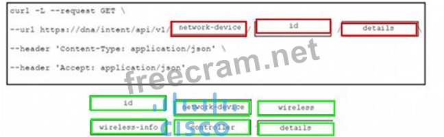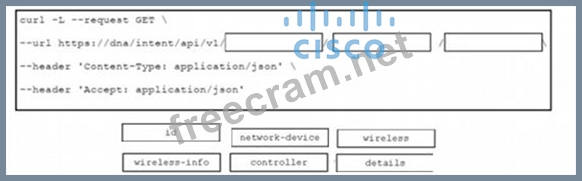 Drag and drop the code from the bottom onto the blanks in the code to construct a cURL command using the Cisco DNA Center API. which will provide the details of a WLAN controller with Id af397748444. Not at options are used.