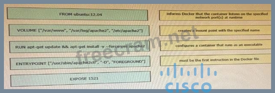 Drag and drop the Docker file instructions from the onto correct descriptions on the right. Not all options are used.