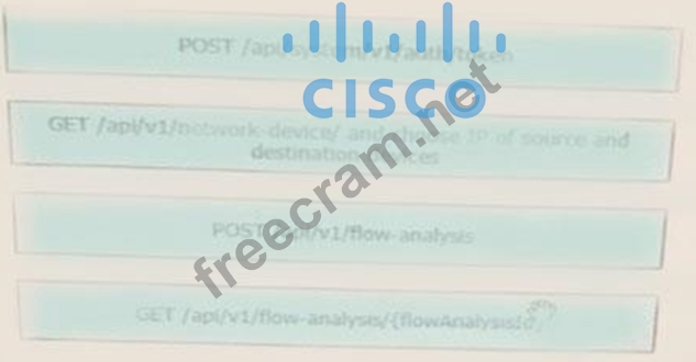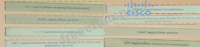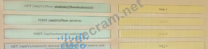 Drag and drop the requests from the left into the correct order on the right to create and check the path trace between two devices using Cisco DNA center API.