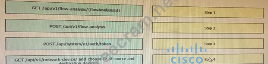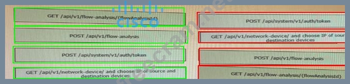 Drag and drop the requests from the left into the correct order on the right to create and check the path trace between two devices using Cisco DNA center API.