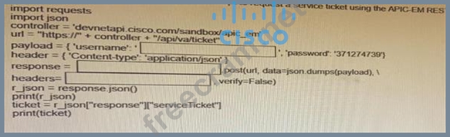Fill in the blanks to complete the python script to request a service ticket using the APIC-EM rest API for the user "devnetuser".