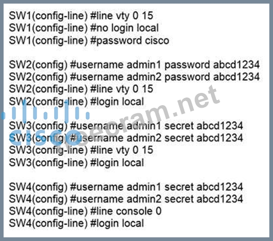 Refer to the exhibit. An administrator configures four switches for local authentication using passwords that are stored as a cryptographic hash. The four switches must also support SSH access for administrators to manage the network infrastructure. Which switch is configured correctly to meet these requirements?