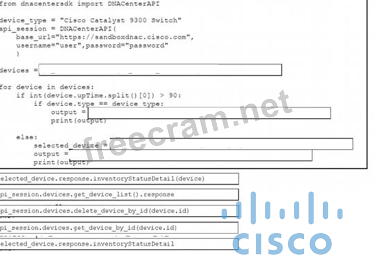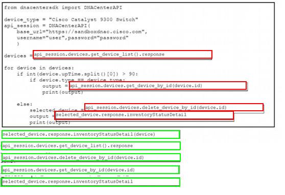 A Python script must delete all Cisco Catayst 9300 Series switches that have an uptime that is greater than 90 days The script must also query for the status of all the other devices Drag and drop the code from the bottom onto the bottom box the code is missing to complete the script Not at options are used