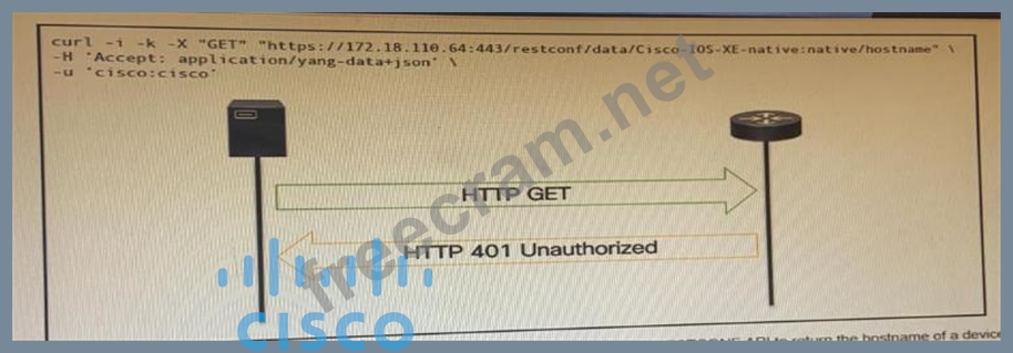 An administrator attempts to perform a GET using the Cisco IOS XE RESTOCNF API to return the hostname of a device. The sequence diagram illustrated the HTTP message observed. Which change to the API request resolves the issue?