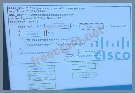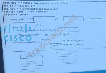 Drag and Drop the code from the bottom onto the box where the code is missing on the Meraki Python script to create a new network
