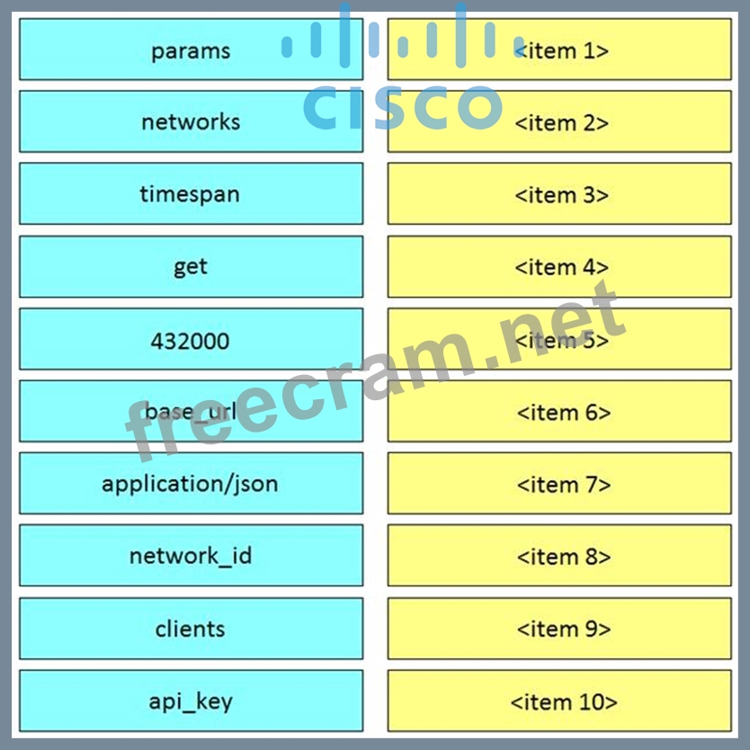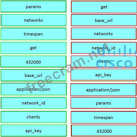 Drag and drop the code from the left code from the left onto the item number on the right to complete the Meraki code to obtain a list of client which have used this network.