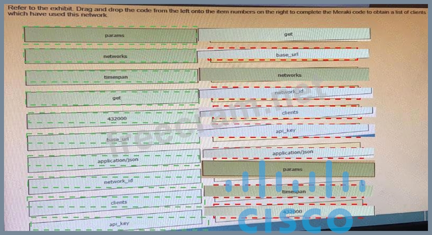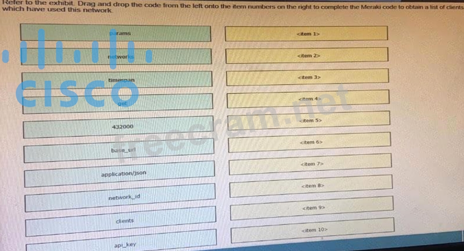 Drag and drop the code from the left code from the left onto the item number on the right to complete the Meraki code to obtain a list of client which have used this network.