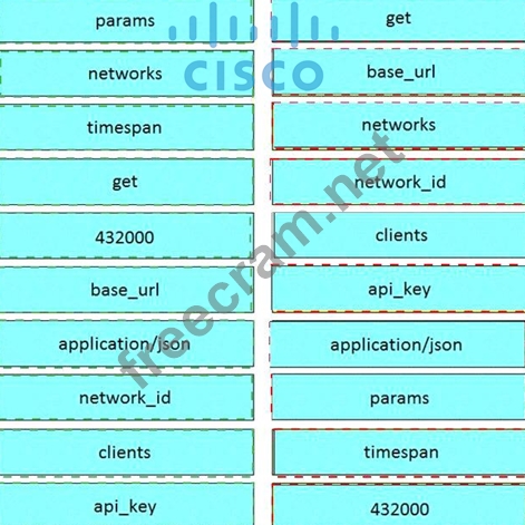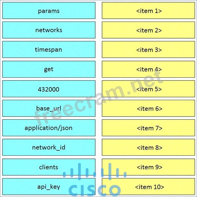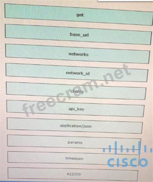 Drag and drop the code from the left code from the left onto the item number on the right to complete the Meraki code to obtain a list of client which have used this network.