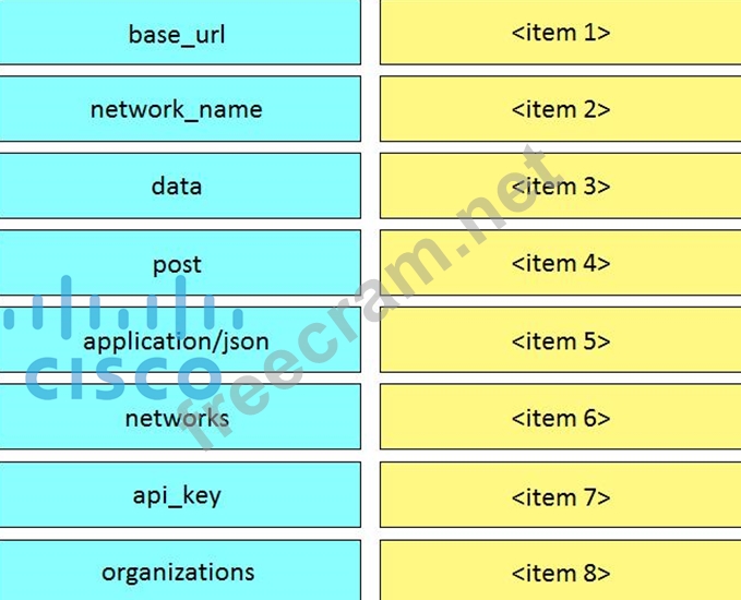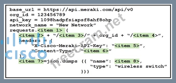 Drag and drop the code from the left onto the item numbers on the right to complete to Meraki python script shown in the exhibit.