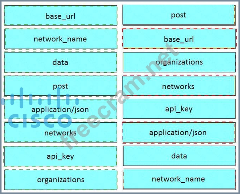 Drag and drop the code from the left onto the item numbers on the right to complete to Meraki python script shown in the exhibit.