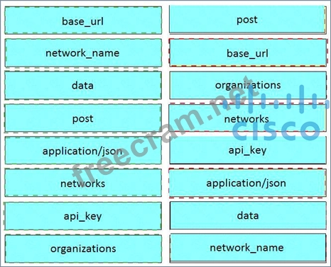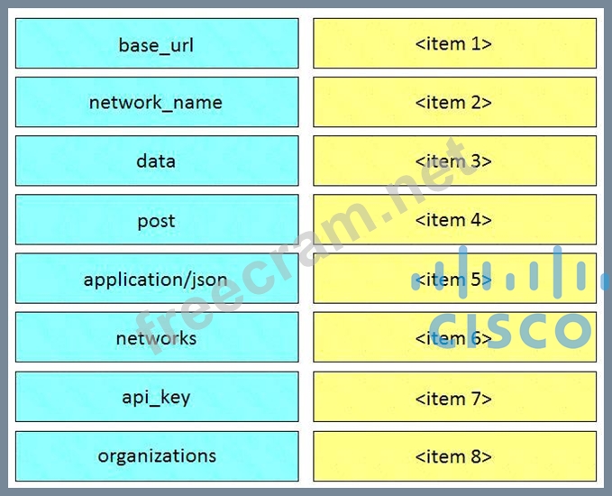 Drag and drop the code from the left onto the item numbers on the right to complete to Meraki python script shown in the exhibit.