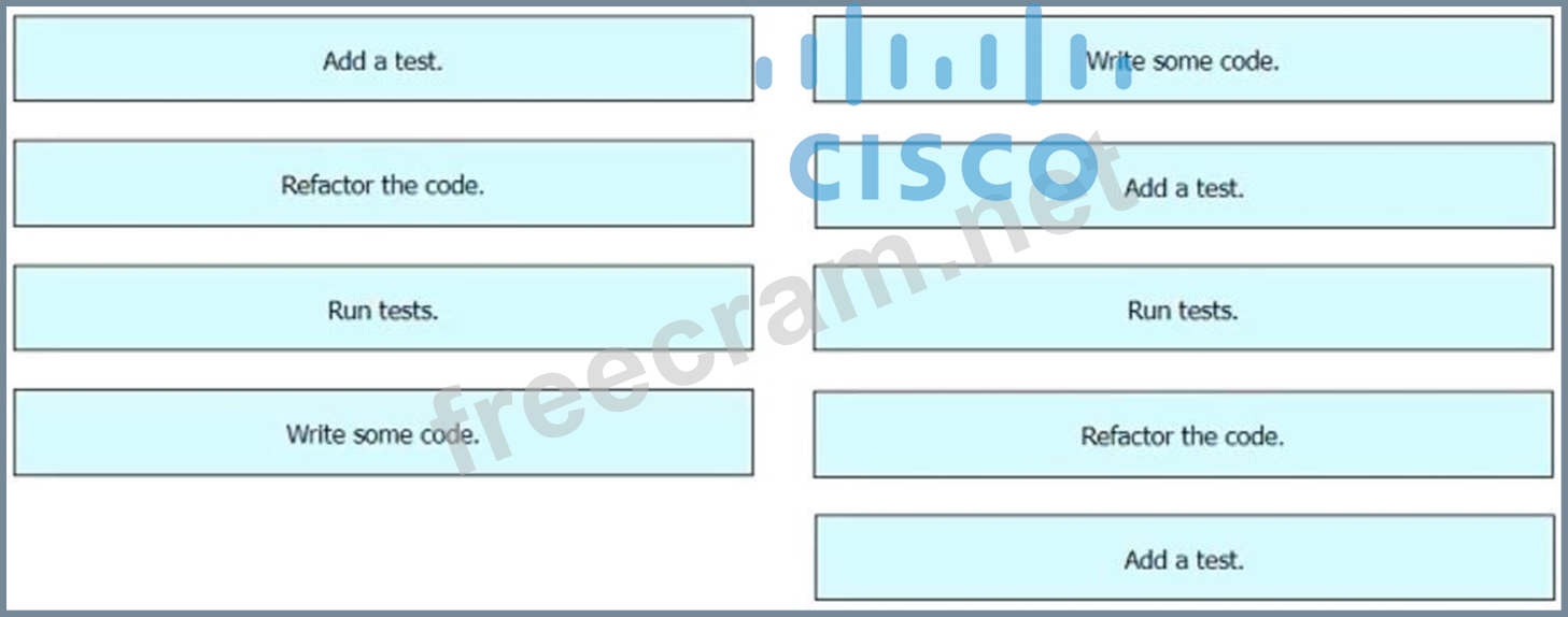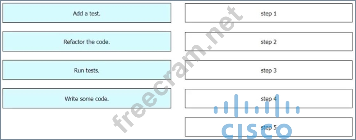 Drag and drop the steps from the left into the order on the right to create a test-driven development cycle. Some options are used more than once.