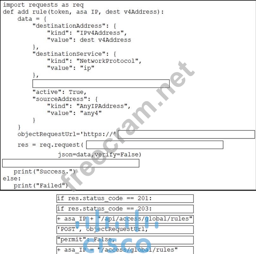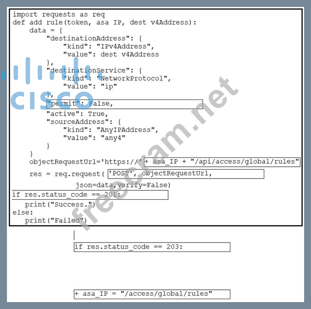 Refer to the exhibit. Drag and drop the code from the bottom onto the box where the code is missing to complete the function that adds a new global access rule that denies traffic using the Cisco ASA REST API. Not all options are used.