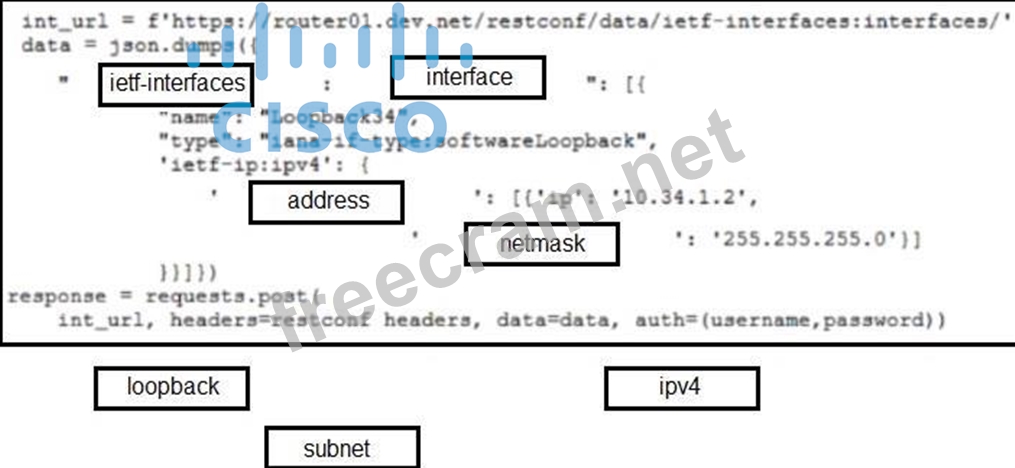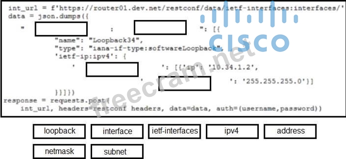 Refer to the exhibit. A new loopback34 must be created on a Cisco IOS XE router that has an IP address of 10.34.1.2/24. Drag and drop the code from the bottom onto the box where the code is missing to construct the Python script that configures the IP address on the interface according to the YANG data model of ietf-interfaces. Not all options are used.