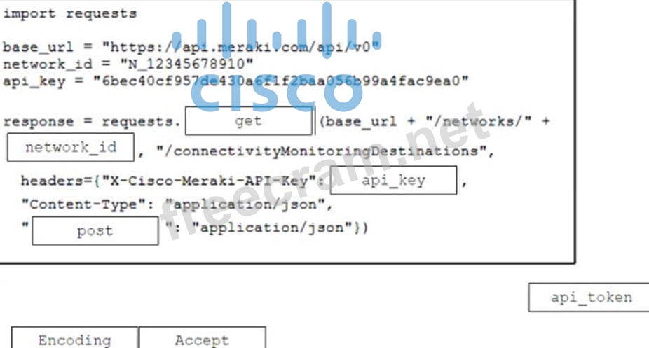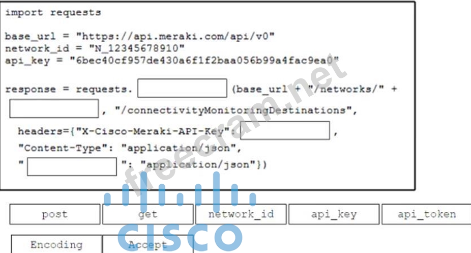 Refer to the exhibit. Drag and drop the code from the bottom onto the box where the code is missing in the Cisco Meraki code to obtain the connectivity testing destinations for an MX network. Not all options are used.