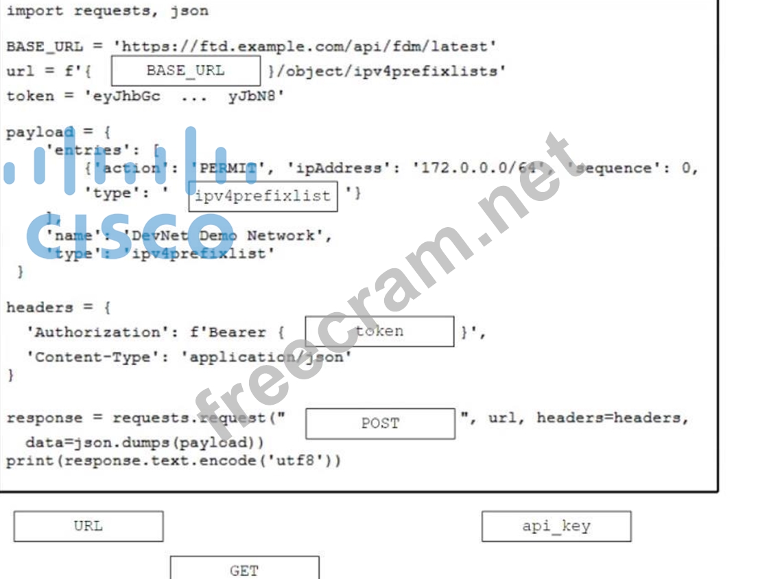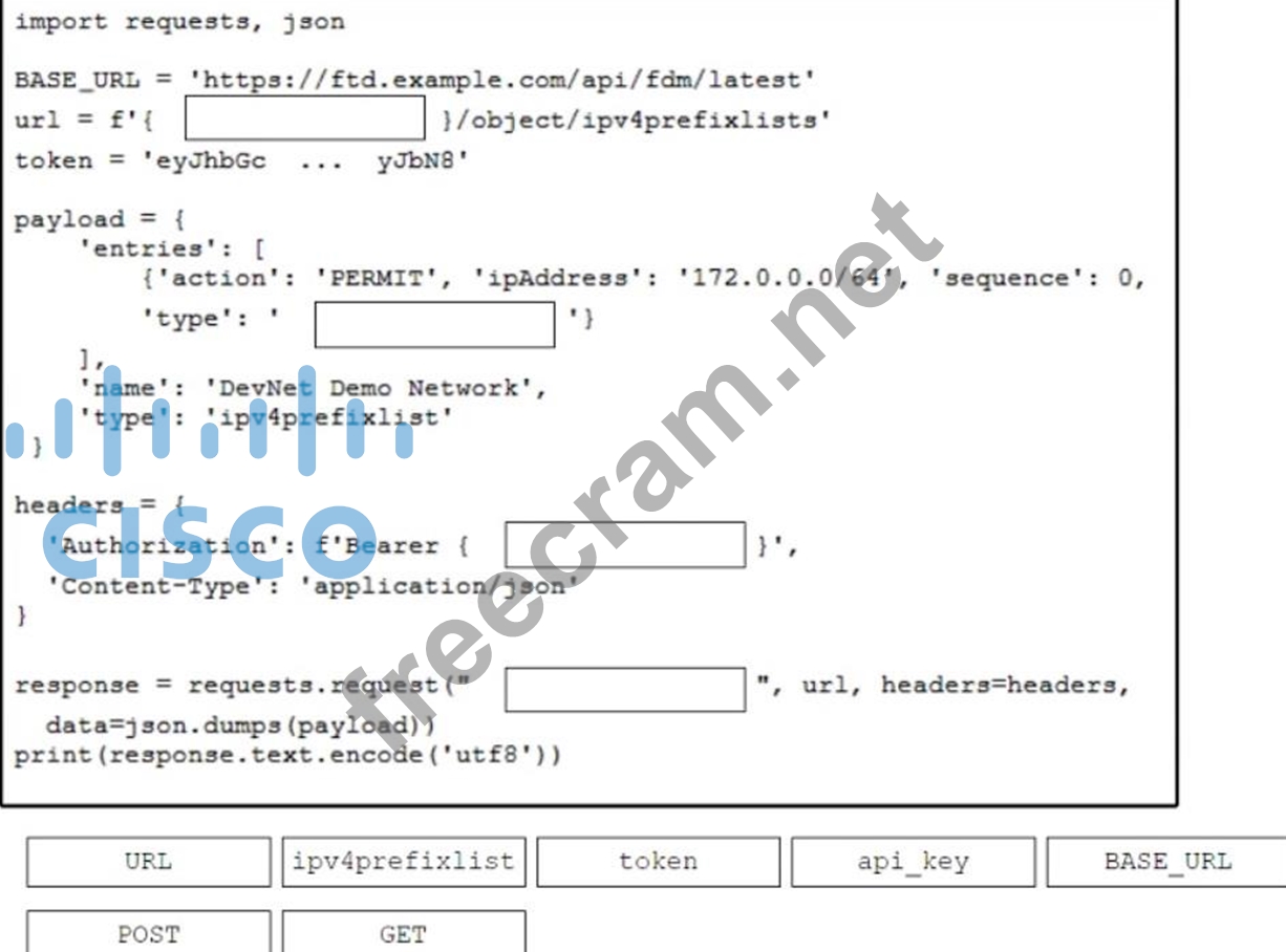 Refer to the exhibit. Drag and drop the code from the bottom onto the box where the code is missing to construct an API request that creates a new IPv4 prefix. Not all options are used.