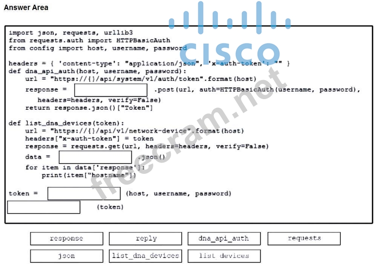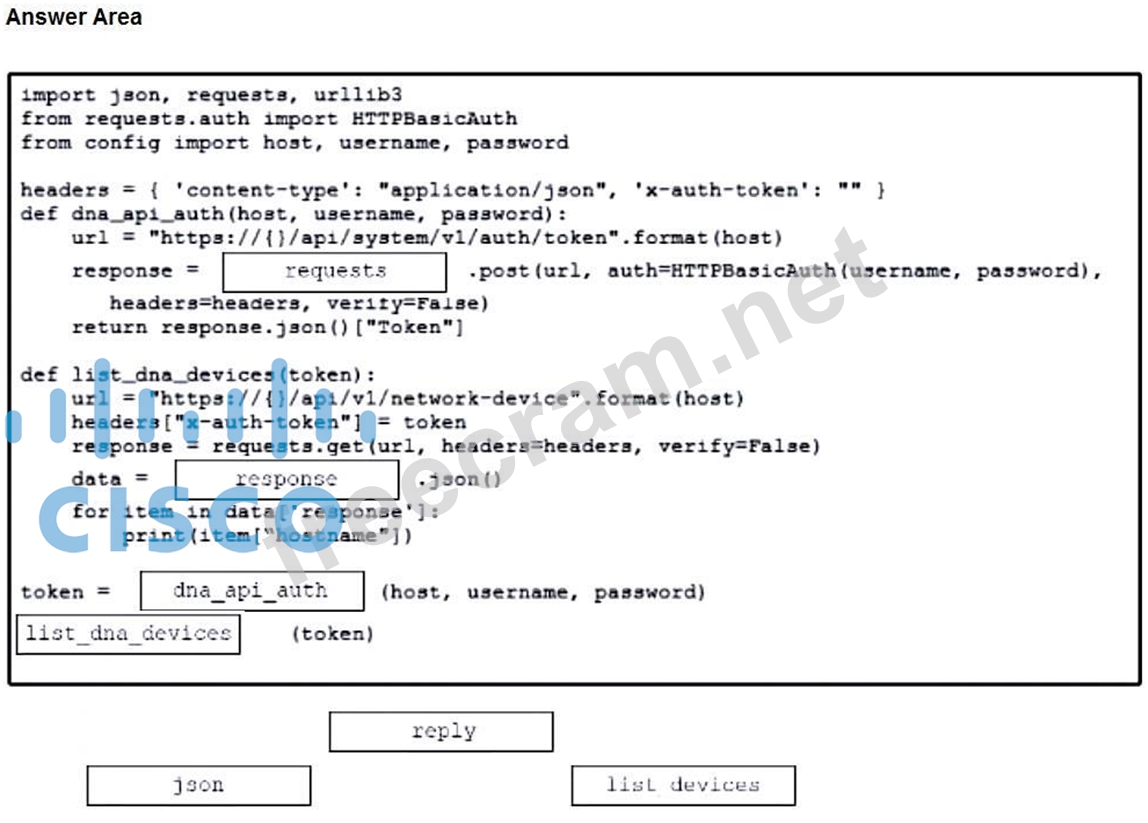 Refer to the exhibit. Drag and drop the code from the bottom onto the box where the code is missing to construct a request that generates a security token and gets a list of network devices.
