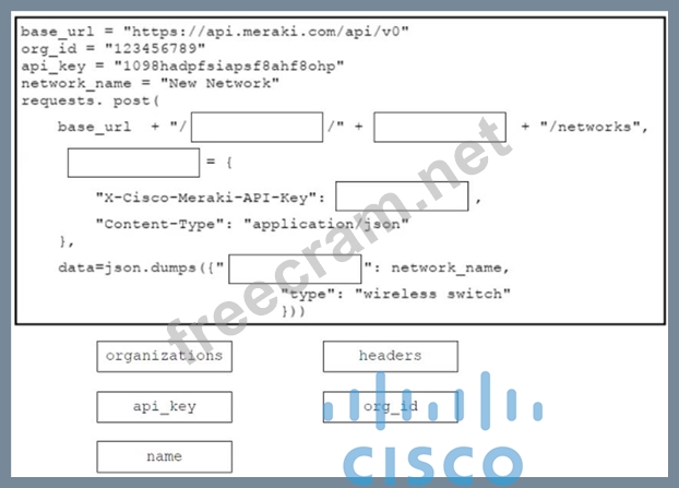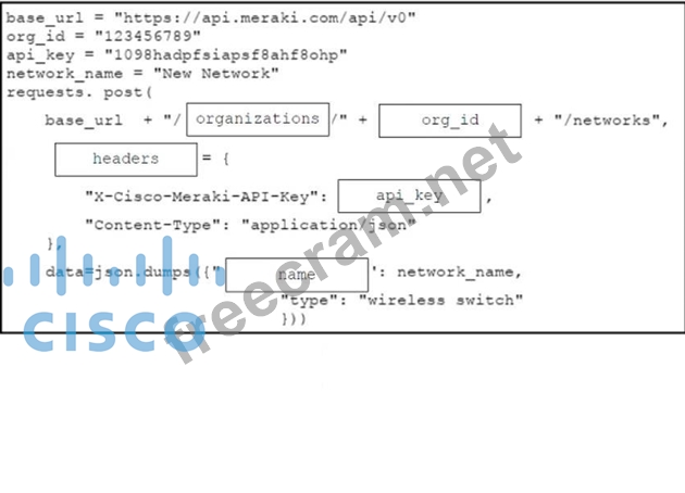 Refer to the exhibit. Drag and drop the code from the bottom onto the box where the code is missing on the Meraki Python script to create a new network.