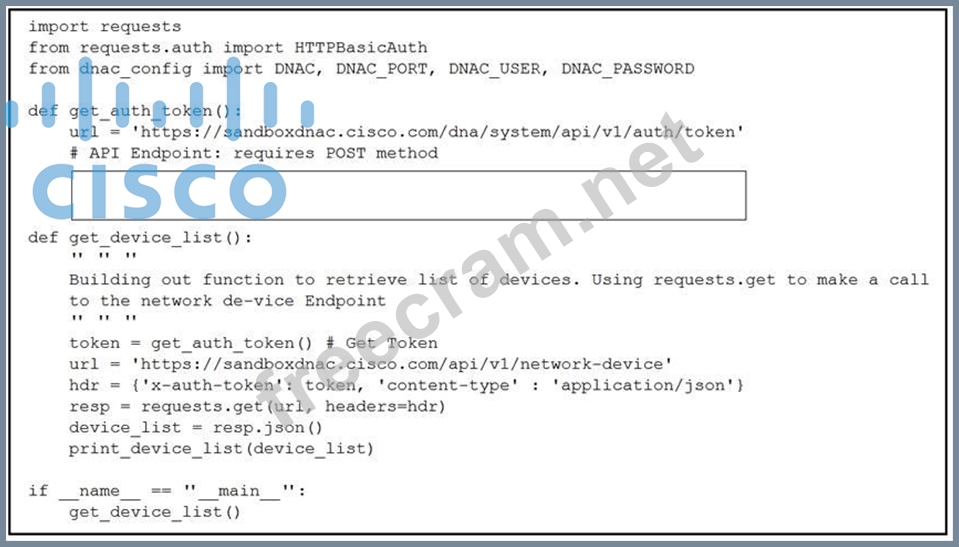 Refer to the exhibit. A developer creates a script to obtain a list of devices by using the Cisco DNA Center API. The remote server authorizes the request only if an authentication token is supplied in the headers. A function named get_auth_token() must retrieve a valid token by using HTTP Basic Authentication. Which code must be added to complete the get_auth_token() function?