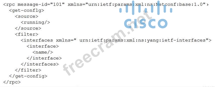 Refer to the exhibit. A network engineer uses model-driven programmability to monitor and perform changes on the network. The network engineer decides to use the NETCONF RPC message to complete one of their tasks. What is accomplished by sending the RPC message?