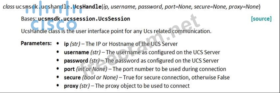 Refer to the exhibit. Given the API documentation for the UCS SDK Python class, Ucsl-landle, which code snippet creates a handle instance?