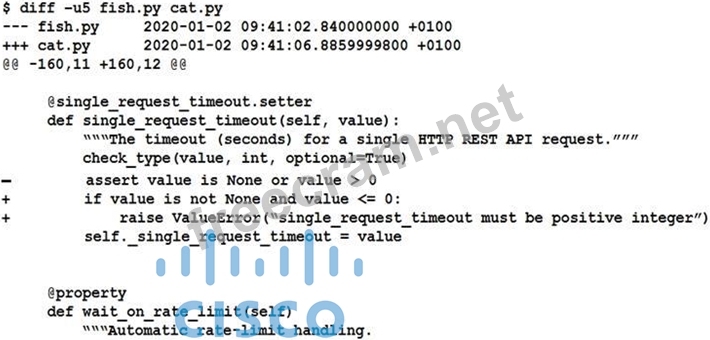 "-" sign comes from fish.py, while a line with a "+" sign comes from cat.py. In most cases, Git picks fish.py and cat.py in such a way that you can think of fish.py/- as "old" content and cat.py/+ as "new" content.