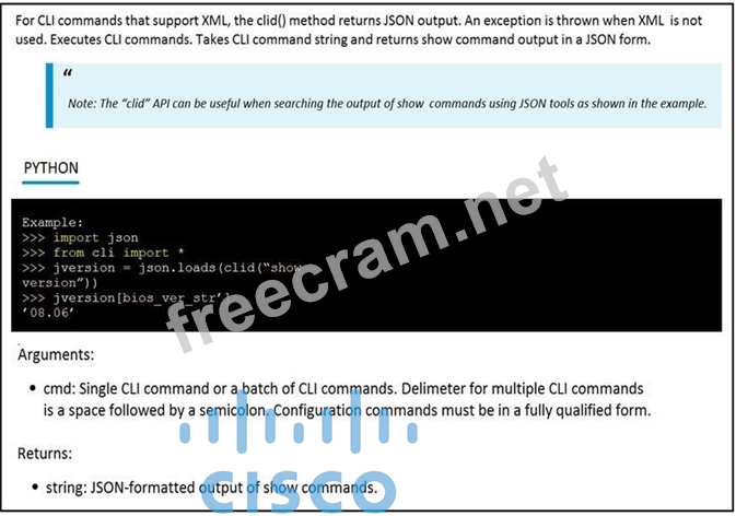 Refer to the exhibit. The Python interpreter and the Cisco Python SDK are available by default in the Cisco NX-OS Software. The SDK documentation shows how the clid() API can be used when working with JSON and XML.