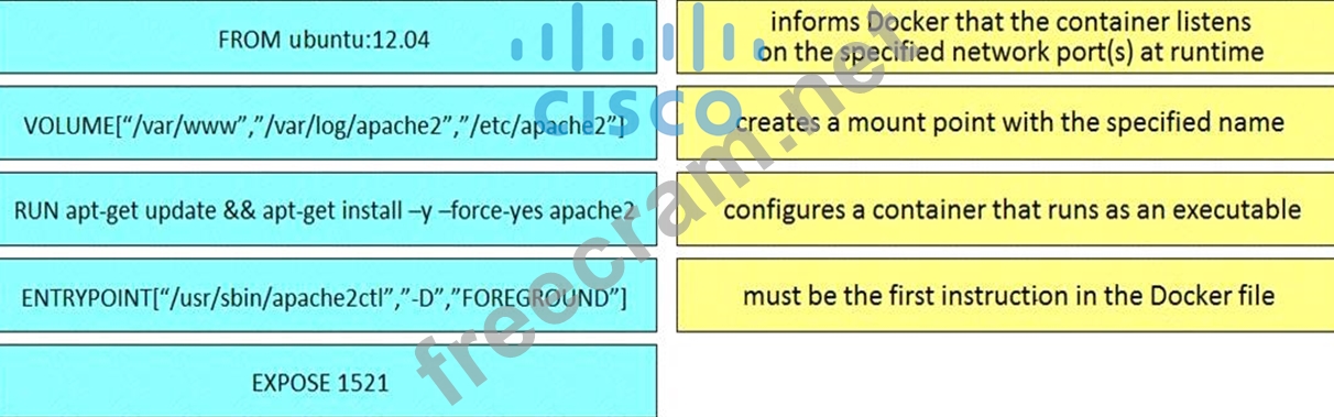 Drag and drop the Dockerfile instructions from the left onto the descriptions on the right. Not at options are used.
