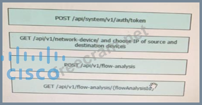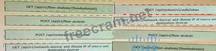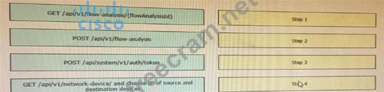 Drag and drop the requests from the left into the correct order on the right to create and check the path trace between two devices using Cisco DNA center API.