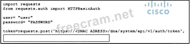 Refer to the exhibit. A developer must use a token to collect data from Cisco DNA Center API and prepares a Python script to send requests. Which line of code needs to be placed on the snippet where the code is missing to obtain a token from the Cisco DNA Center API?