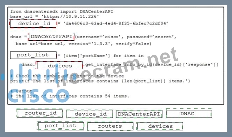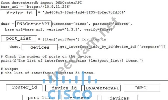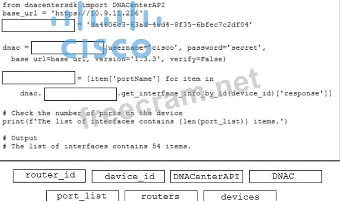 Refer to the exhibit. Drag and drop the code from the bottom onto the box where the code is missing to return the number of interfaces on a network device by using the Cisco DNA Center SDK. Not all options are used.